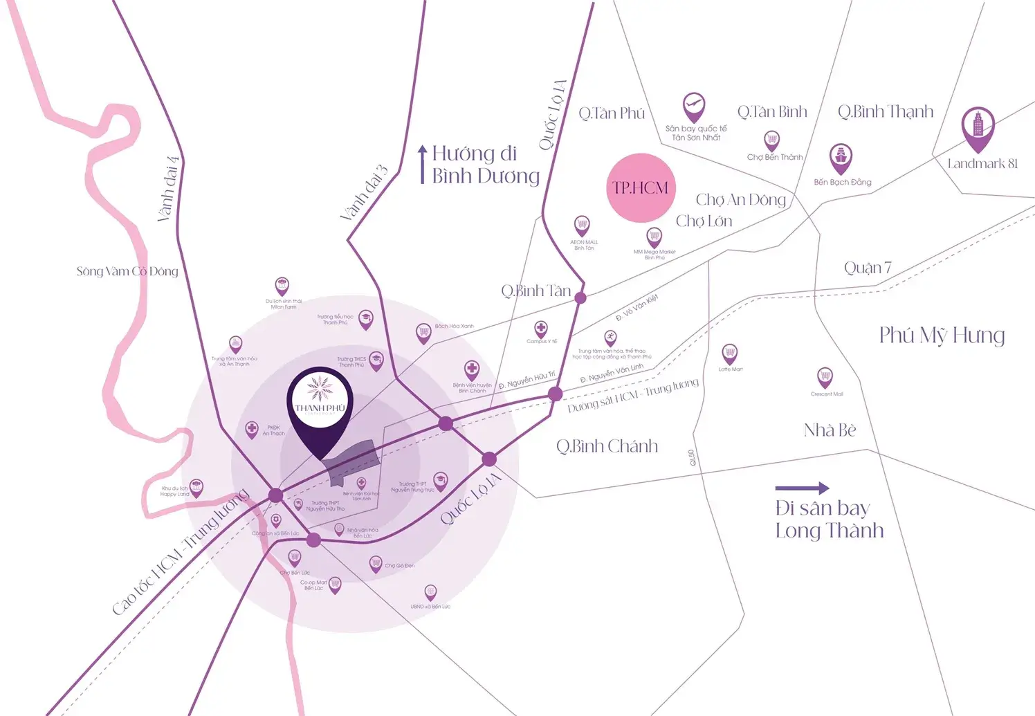 Thanh Phú Centre Point tọa lạc ngay mặt tiền đường 830C, Bến Lức, Long An, trải dọc bờ sông Rạch Dơi thơ mộng. Dự án sở hữu vị thế ngã năm giao thông, là cửa ngõ kết nối 3 vùng kinh tế trọng điểm: TP.HCM, Đông Nam Bộ và Đồng bằng Sông Cửu Long.